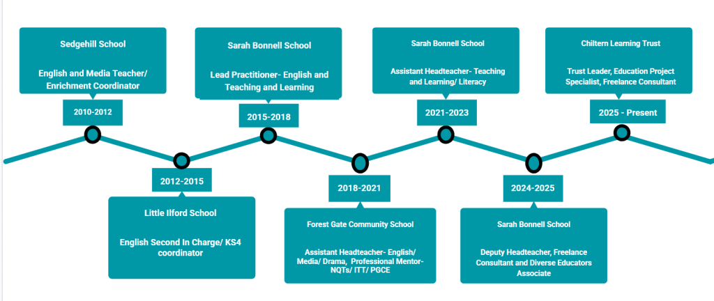In figure one, you can see my somewhat linear career timeline: English teacher, enrichment coordinator, English second in charge, Lead Practitioner, Assistant Headteacher and Deputy Headteacher.